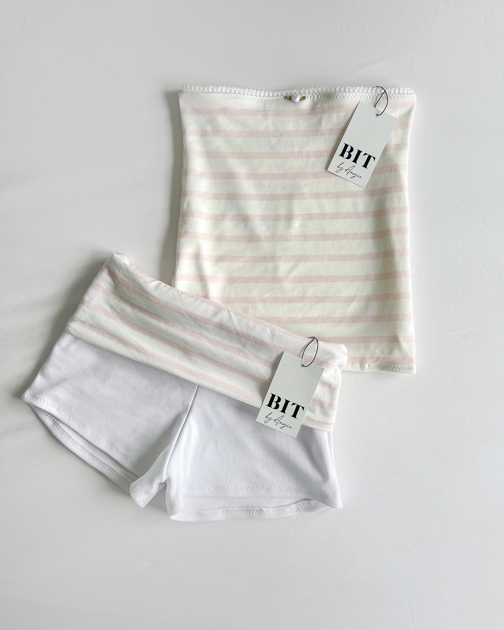 - Handmade milkshake pink & cream striped tube top with matching fold over shorts